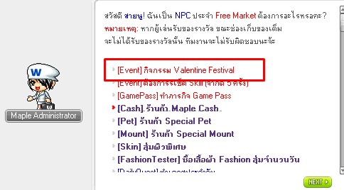 ตัวอย่าง โดยสามารถซื้อได้ที่ NPC Maple Adminstrator หากผู้เล่นซื้อแล้ว สถานะ Festival Pass จะเปลี่ยนจาก ยังไม่มี เป็น มีแล้ว